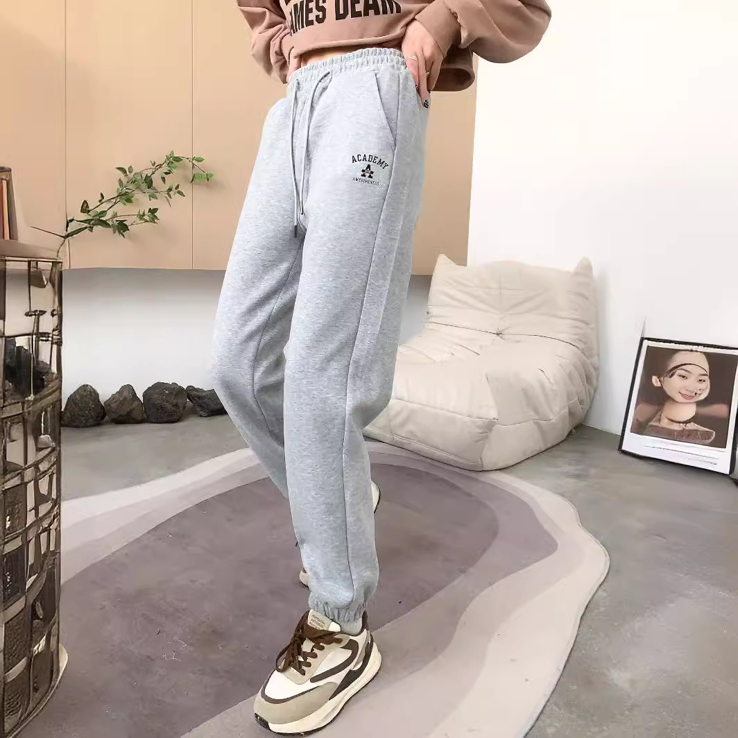 حجم الجري الرخيص، بنطال رياضي من القطن الصيني المركب والحرير والحليب، بشعار عصري، رياضي غير رسمي فضفاض ومريح مربوط بالكاحل للنساء