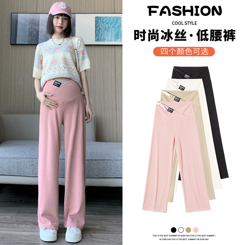 لقطة حقيقية للنساء الحوامل صيف جديد من الحرير الجليدي منخفض الخصر بنطال ذو قصة أرجل واسعة حبال موضة ضيقة متقاطعة الخصر سروال تكييف الهواء