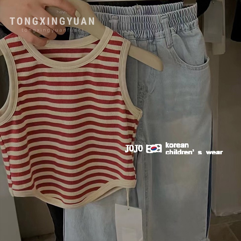 الأطفال الكورية نمط ثوب أطفال الفتاة مخطط سترة الصيف نمط جديد للأطفال المألوف قميص بدون أكمام T طفل T