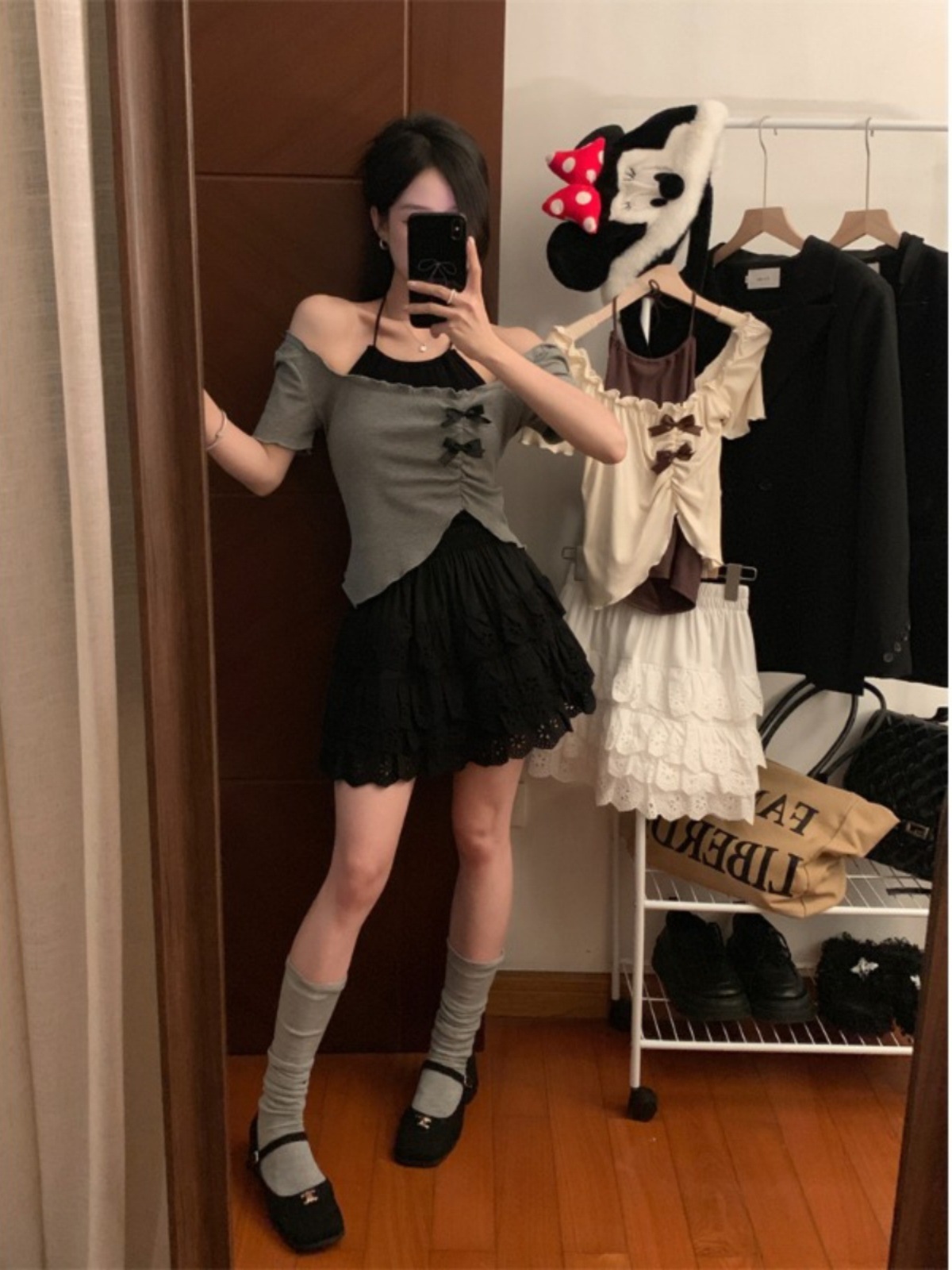 الفتاة الرغبة النقية بدلة حلوة المرأة صيف 2024 جديد قصير الأكمام أعلى قاعدة حزام تنورة دانتيل ثلاث قطع مجموعة