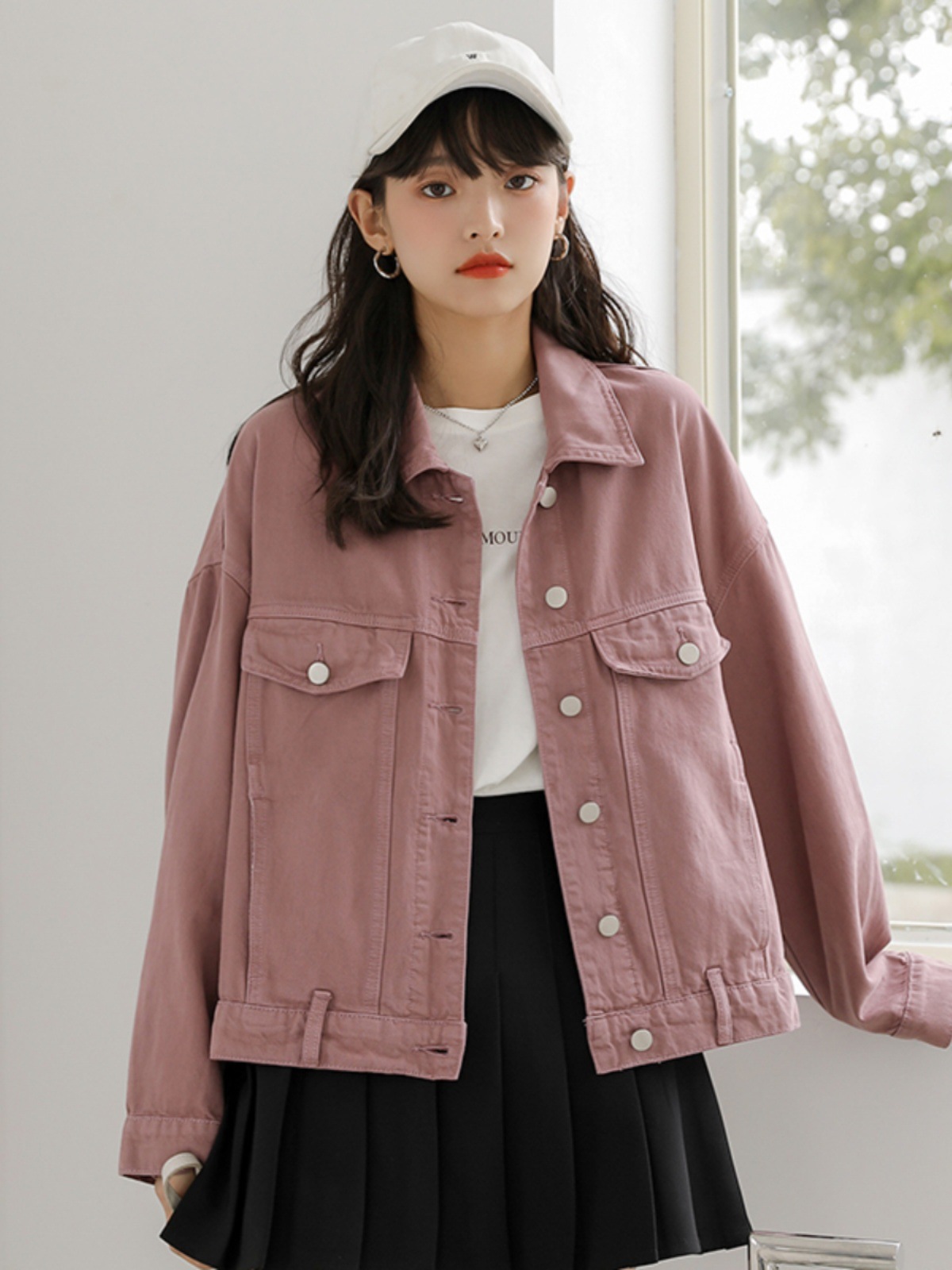بدلة بيسبول وردية للسيدات فضفاضة على الطراز الكوري ريترو هونج كونج ستايل على طراز الكلية سترة من قماش الدنيم بنمط جديد ومناسبة لجميع المناسبات