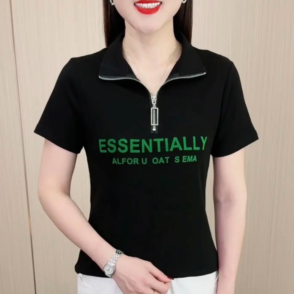 بلوزة صيفية بأكمام قصيرة وياقة بسحّاب أنيقة ومطبوعة بحروف كورية نحيفة
