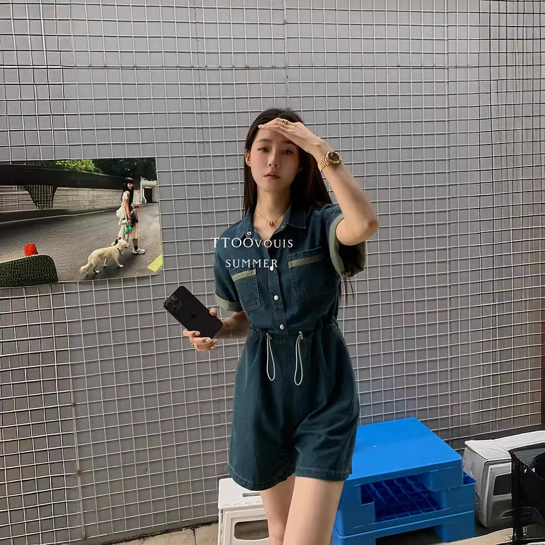 TTOO ثلاثة عشر خط 1787 بدلة من قماش الدنيم المغسول الخصر مغلقة مطوي طوق القميص ملابس العمل بأكمام قصيرة نمط بذلة للنساء