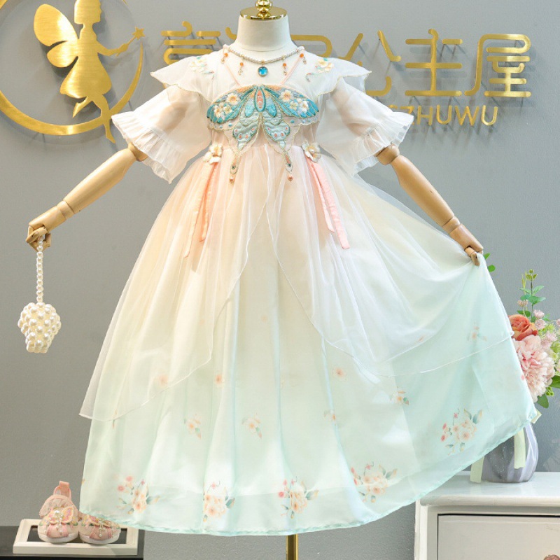 فستان بناتي Hanfu 2024 صيفي جديد على الطراز الصيني مُحسّن مطرز على شكل سحابة بكتف شبكي فستان على الطراز العرقي للأطفال