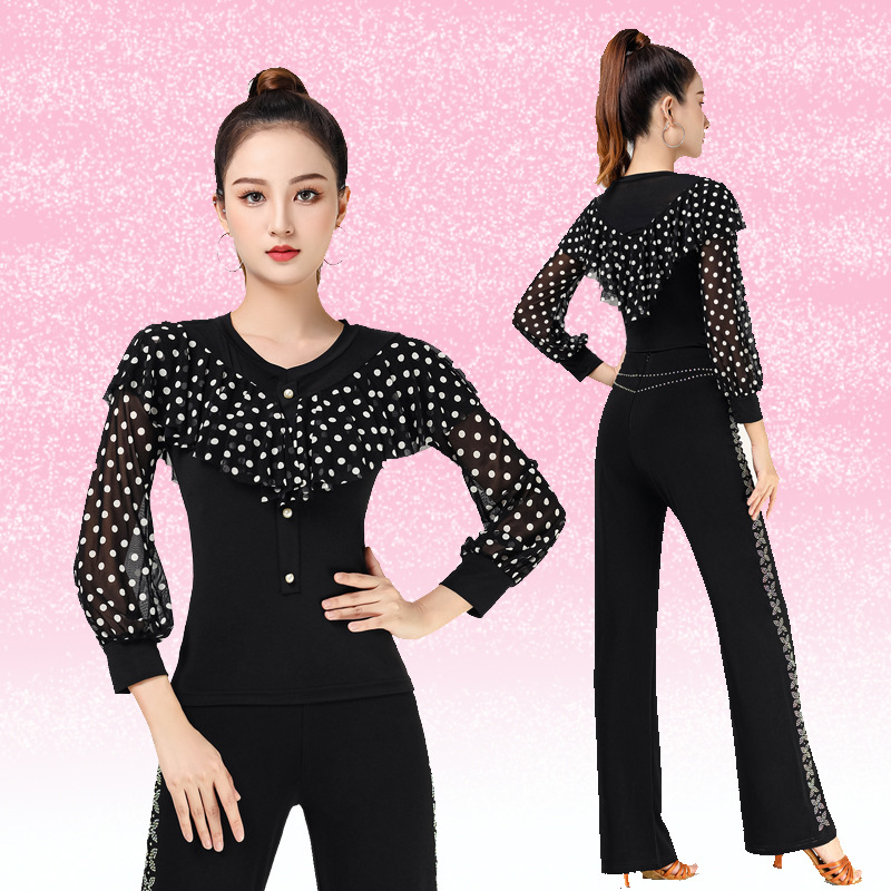 ملابس الرقص العصرية، ملابس الرقص المربعة الجديدة للربيع والخريف، ملابس رقص لاتينية منقط بأكمام طويلة وشبكة، ملابس رقص Jitterba