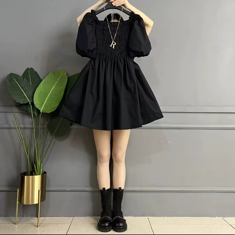 تنورة نسائية بسيطة ذات أكمام قصيرة ورقبة مربعة وخصر مربعة لتقليل العمر