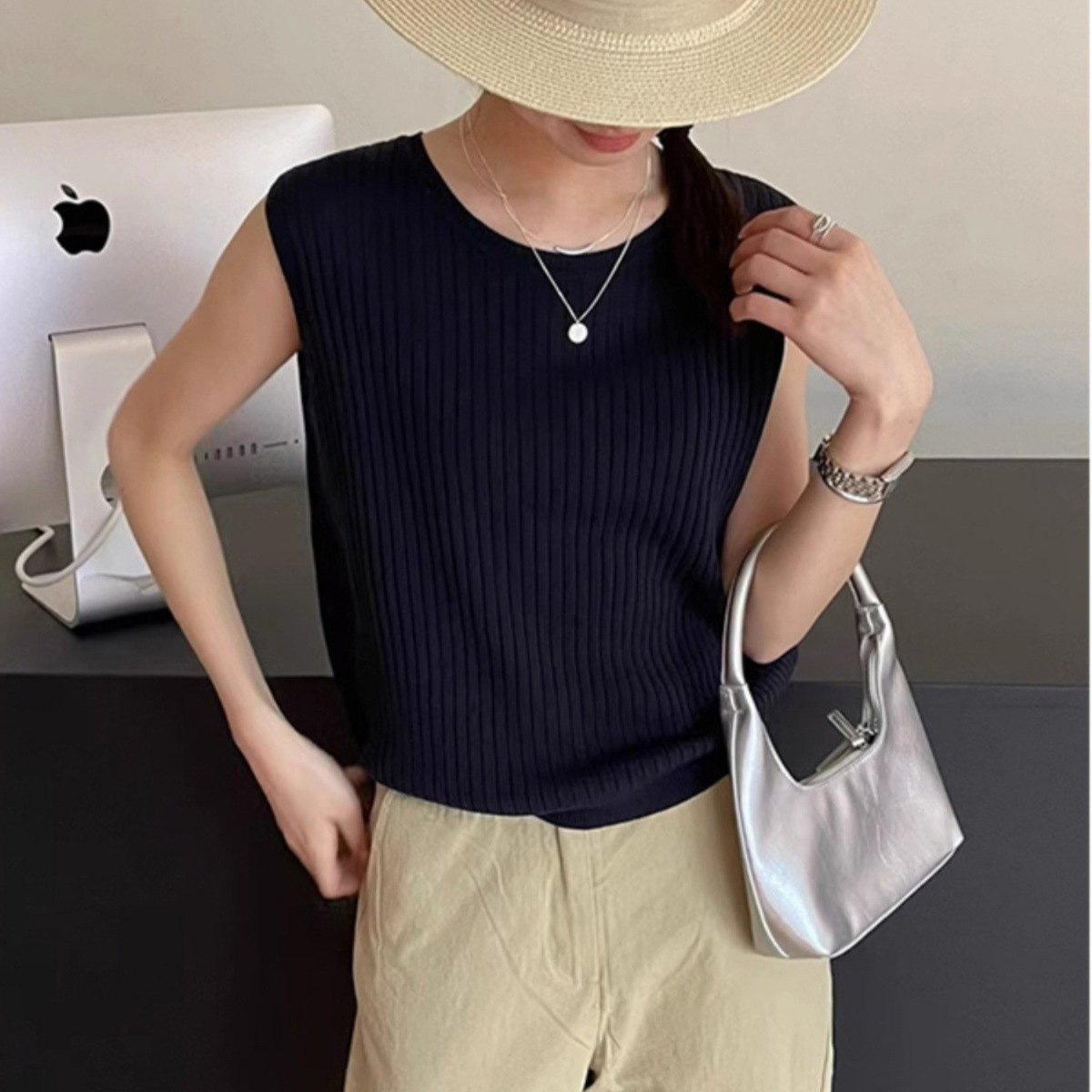 المشمش المتخصصة تصميم تحسس الجوف سترة دون أكمام المرأة الصيف رقيقة فضفاضة الحرير الجليد متماسكة المرأة لباس خارجي