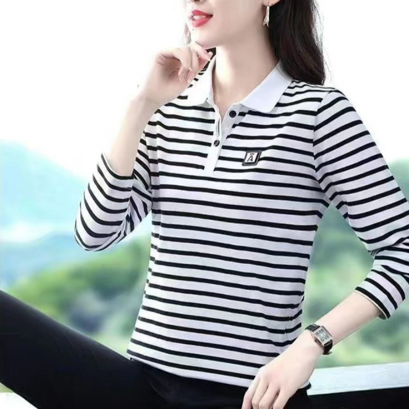 خريف مخطط جديد بأكمام طويلة 2024 قميص بولو على الموضة المرأة البطن تغطي اللحوم الأم كل مباراة قميص قاعدة علوي