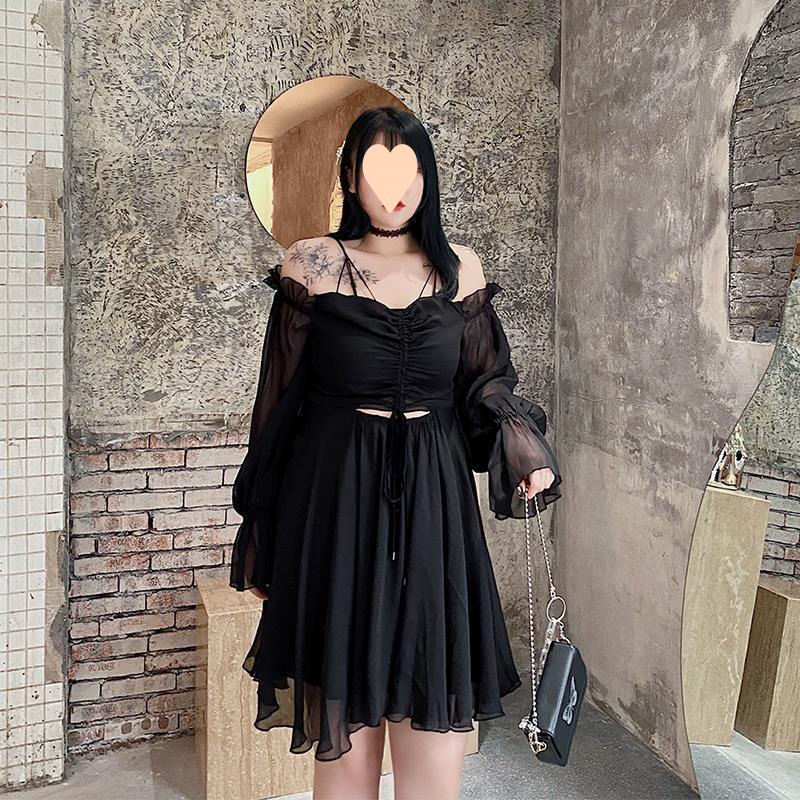 فستان شيفون مثير فضفاض للنساء بكتف نحيف 300 جين مقاس كبير 240 تنورة من التول لتغطية البطن لتقليل العمر