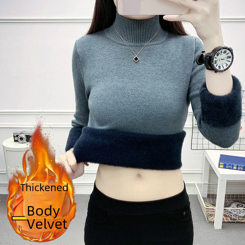 سترة نسائية مخملية من قطعة واحدة سميكة لشتاء 2022 بلوفر جديد نصف ياقة مدورة مبطن بالصوف مع سترة سفلية سوداء