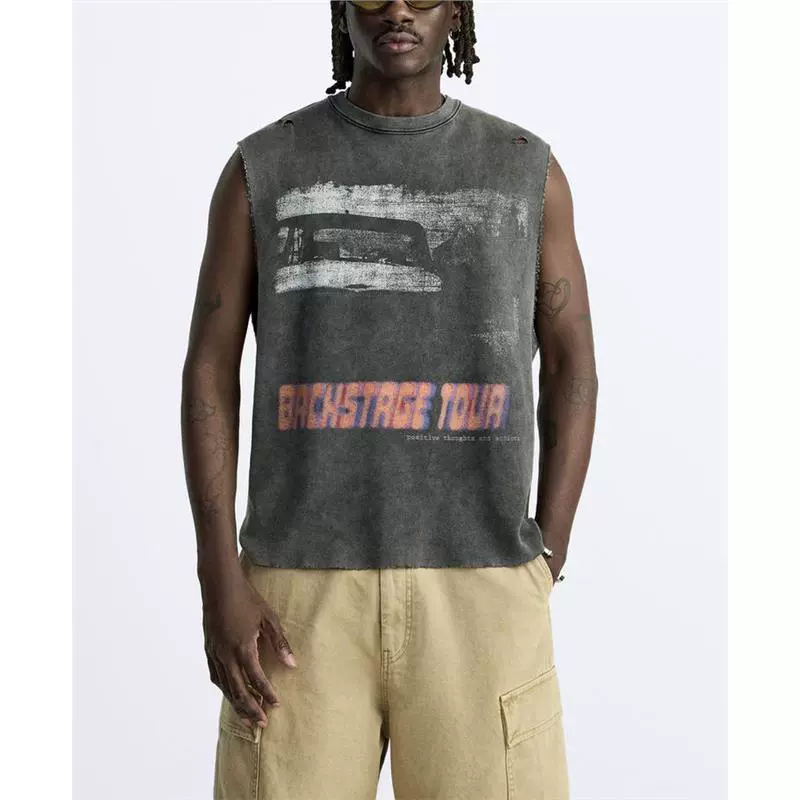 ZA قميص رجالي صيفي غير رسمي نمط الشارع رقبة مستديرة بدون أكمام فضفاض مغسول صور مطبوعة محبوك تي شيرت 4805408
