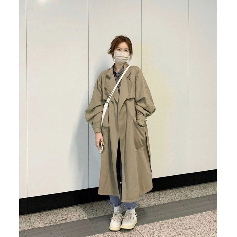 معطف كاكي متوسط الطول للنساء لربيع وخريف 2024 نمط كوري صغير جديد بمزاج شعبي هذا العام