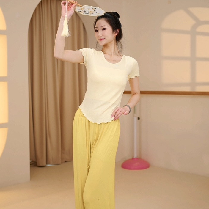 بدلة الرقص الحديثة المرأة بأكمام قصيرة أعلى الربيع والصيف جديد الصينية الرقص الجسم بدلة تدريب الرقص عيد ميلاد اليوغا البدلة