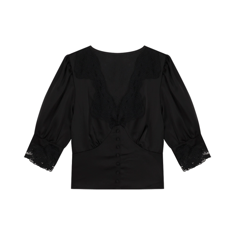 قميص قصير بخياطة من الدانتيل ورقبة على شكل حرف V وأكمام ثلاثة أرباع