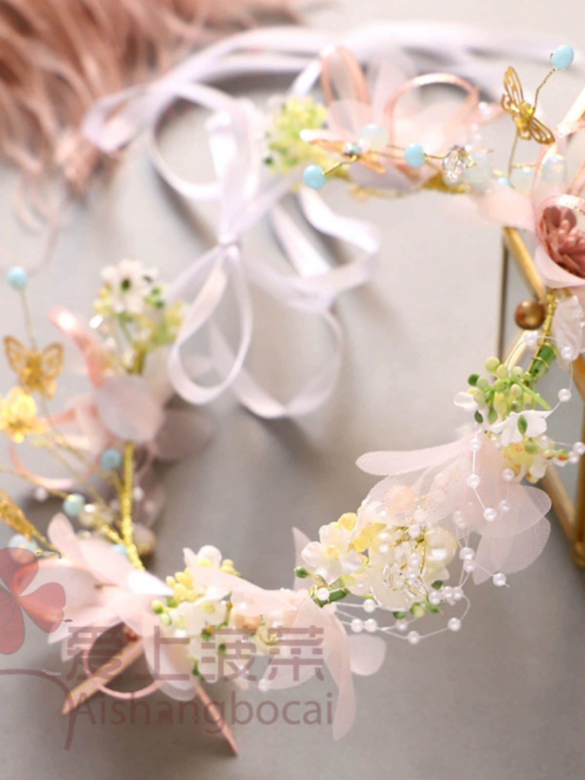 غطاء رأس إكليل الزفاف الجميل والفائق الجنية، عصابة رأس وردية، وشاح زفاف، زهرة معصم، إكسسوارات شعر للأطفال، عصابة رأس