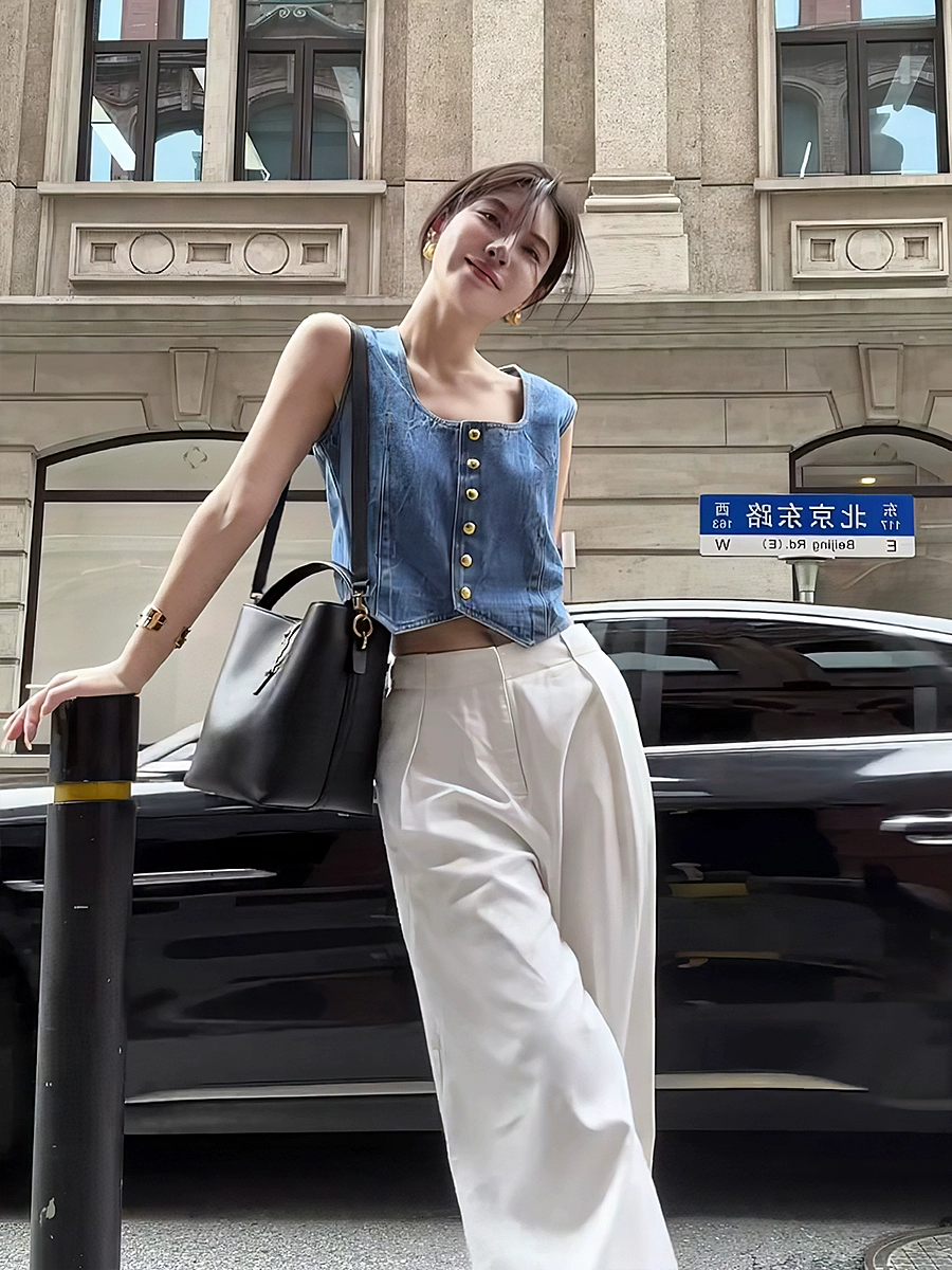 قميص قصير عصري برقبة مربعة من قماش الدنيم