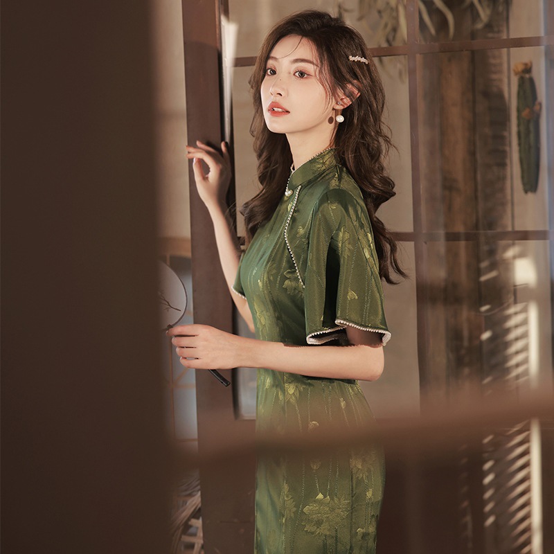Yuetang الأخضر الداكن الجاكار الساتان مقلوب كم كبير شيونغسام السيدات مروحة 2022 صيف جديد تحسين الرجعية جمهورية الصين نمط