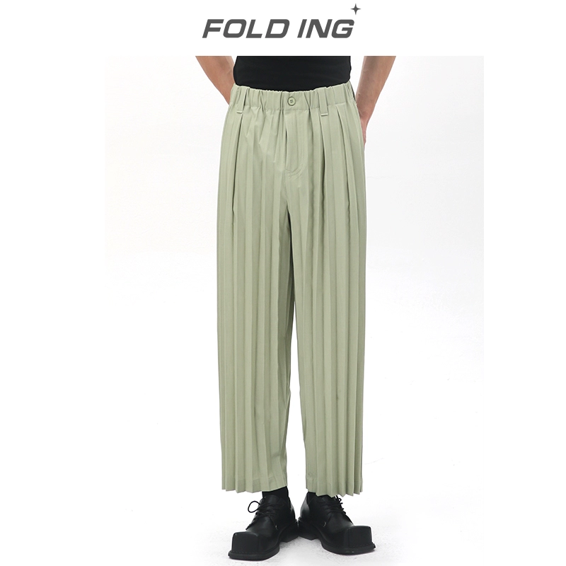 سراويل مستقيمة مصنوعة يدويًا قابلة للطي من مياكي الأكورديون سراويل صيفية فضفاضة ضيقة باللون الأخضر الفاتح للرجال FF286