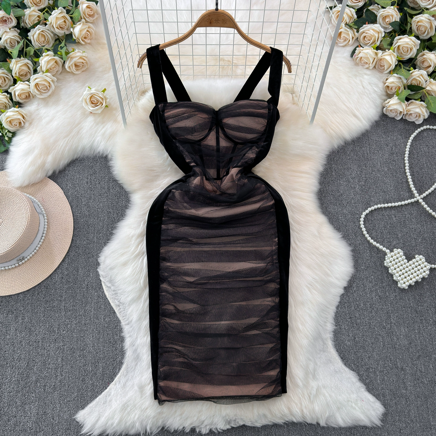 تنورة بحمالات علوية على طراز فتاة مثيرة، تنورة صيفية عصرية شبكية مطوية ومطاطة ضيقة للتخسيس، فستان على شكل الورك للنساء