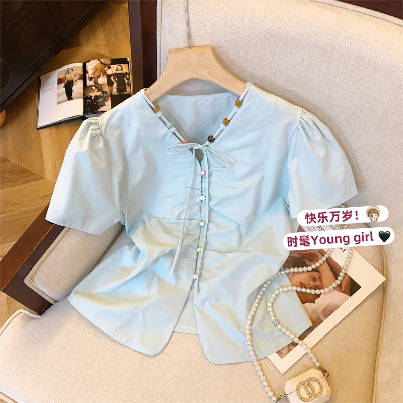قميص شانيل ذو الأكمام الفقاعية للسيدات بتصميم مميز وقميص بفيونكة من الخرز وفريد من نوعه، قميص صغير لطيف للغاية لفصل الصيف