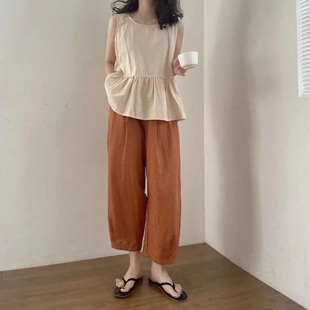 مجموعة من القطن والكتان النحيف النحيف سراويل تسع نقاط من قطعتين