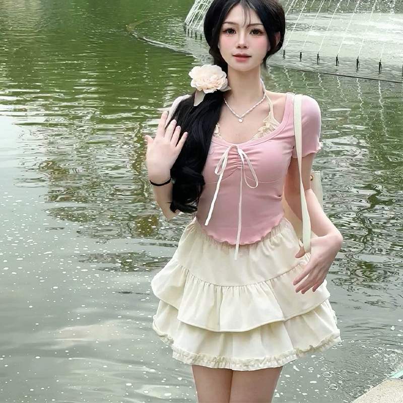ألوان الصيف مطابقة قصيرة الكتف الكورية الكورية الدانتيل الأعلى