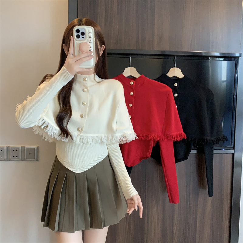 لقطة حقيقية لا تقلل من السترة ذات الياقة شبه العالية والأكمام الطويلة والشال المكون من قطعتين للخريف والشتاء سترة قاعدة جديدة على الطراز الأجنبي