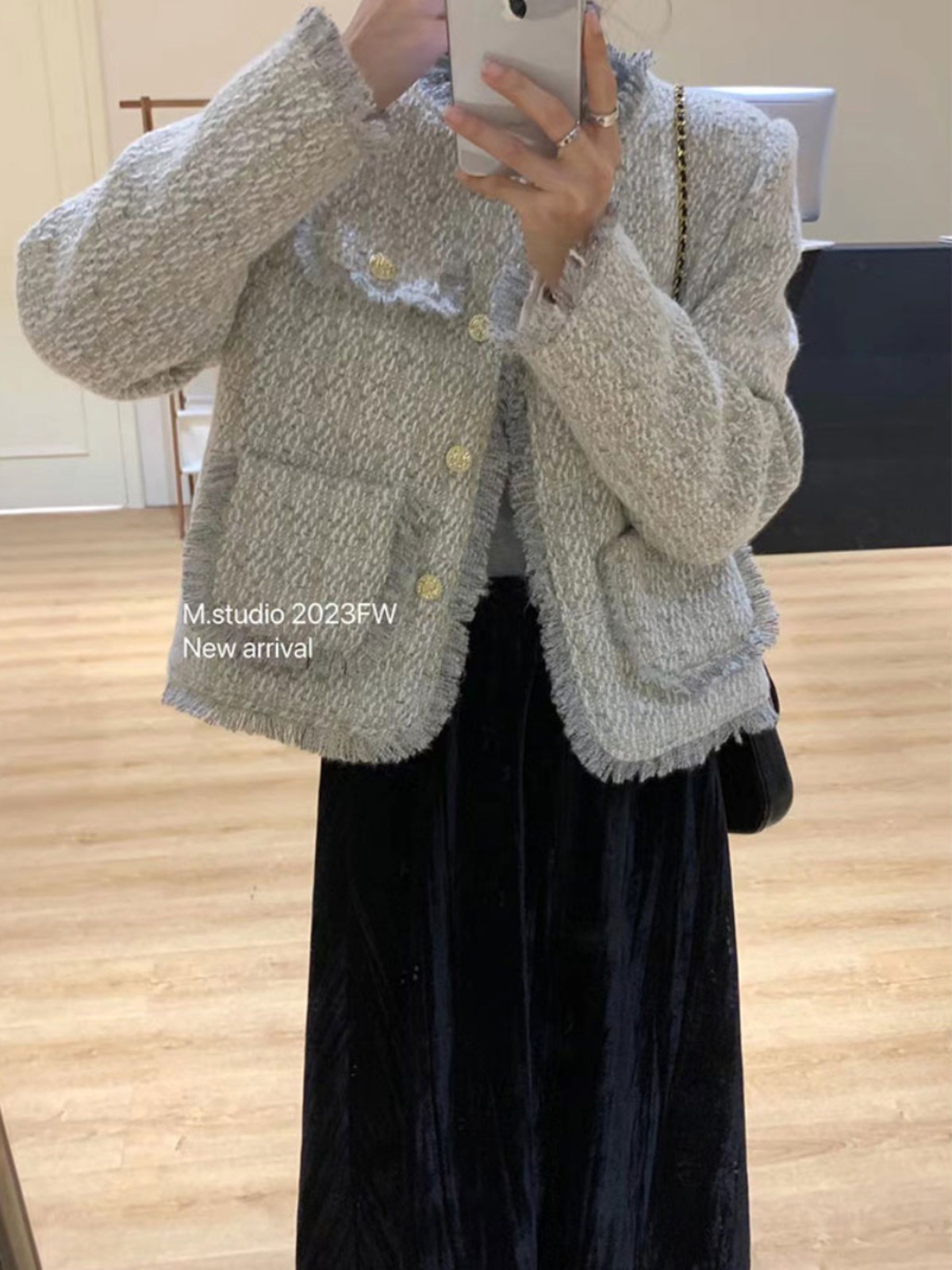 سترة أنيقة بنمط شانيل للسيدات شتوية قصيرة وسميكة ذات رقبة دائرية فرنسية من التويد الأبيض ومعطف من أسفل البط