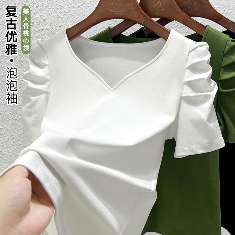 الخوخ طوق قصيرة الأكمام تي شيرت المرأة الصيف 2023 جديد النمط الفرنسي أنيق أعلى نفخة كم تي شيرت أبيض للنساء