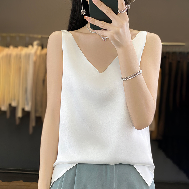 بدلة نسائية صيفية برقبة على شكل حرف V ترتدي سترة حريرية بقاعدة بيضاء من الساتان قميص قصير فضفاض للنساء