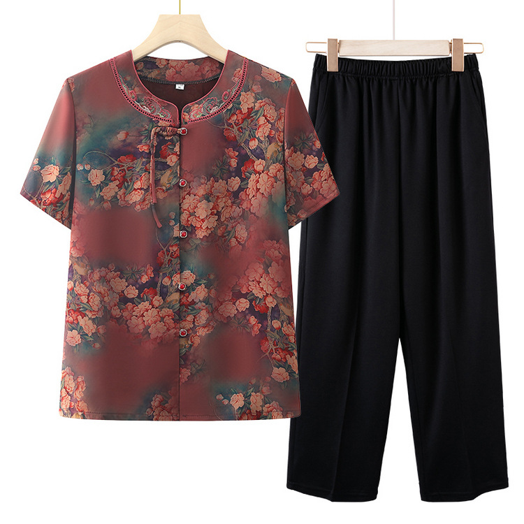 بدلة تي شيرت صيفية بأكمام قصيرة للجدة تبلغ من العمر 60 عامًا فستان أم متوسط العمر وكبار السن سترة Guofeng سترة تانغ طقم مكون من قطعتين