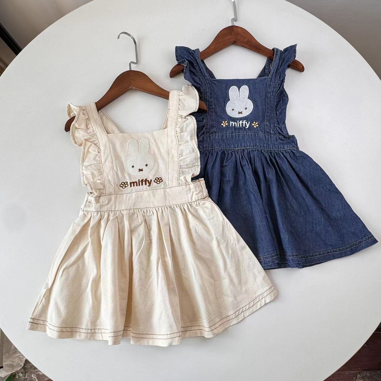 فستان Miffy من الدنيم مكشكش لربيع وصيف 2024 فستان ياباني جديد للفتيات المفردات مزود برسوم كرتونية للأطفال