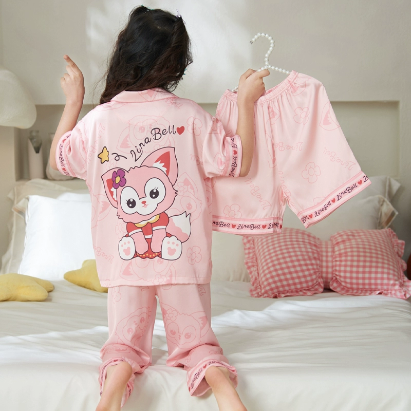 بيجامة للبنات صيفية رقيقة من الحرير الجليدي كورومي ملابس منزلية للأطفال ملابس مكيفة بنطلون طقم من ثلاث قطع