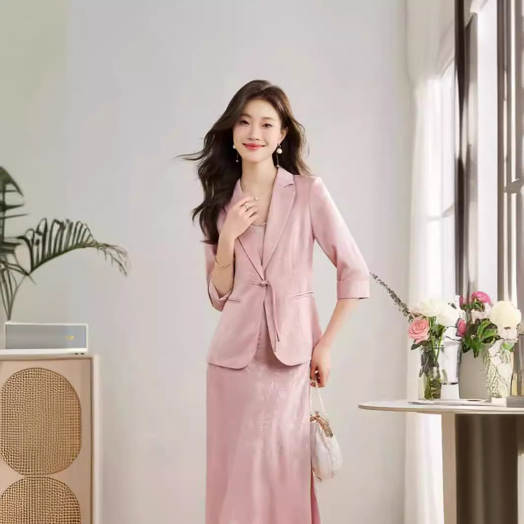 جديد النمط الصيني سبع نقاط كم بدلة صغيرة سترة المرأة الصيف موضة مطبوعة لوتس الجذر النشا اللون دعوى زلة تنورة دعوى