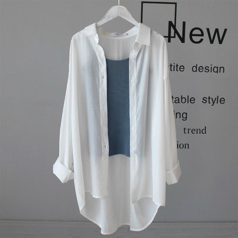 قميص صيفي مناسب للحماية من الشمس قميص أبيض نسائي متوسط الطول من القطن الكسول للحماية من الشمس قميص رقيق خارجي غير رسمي للنساء