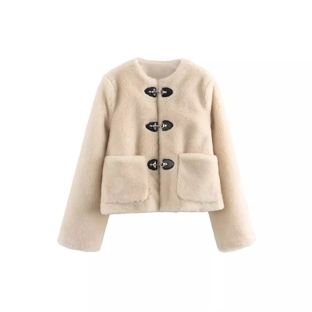 الأوروبية والأمريكية عبر الحدود 2024 نمط جديد وحلو المألوف لونين الربيع مشبك سترة الصوف فضفاضة ومريحة الرقبة المستديرة للنساء