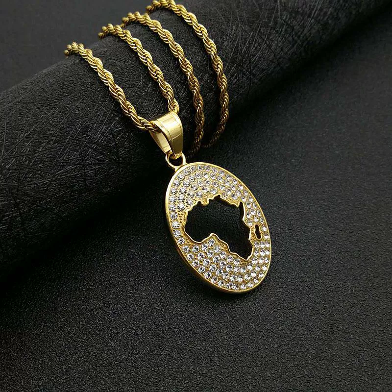 الأوروبية والأمريكية شعبية الهيب هوب الهيب هوب المجوهرات التيتانيوم الصلب مطلية بالذهب الماس الأفريقية قلادة على شكل خريطة قلادة شخصية عصرية ومتعددة الاستخدامات