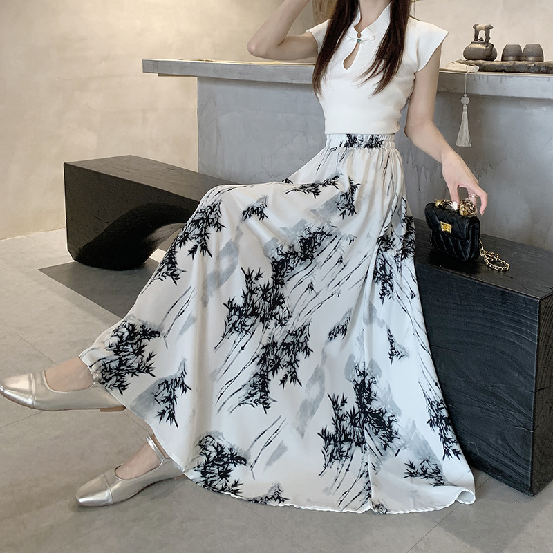 جديد النمط الصيني النمط الصيني الحبر اللوحة تنورة المرأة الصيف عالية الخصر ألف خط تنورة طويلة نصف تنورة زن المرأة مظلة تنورة