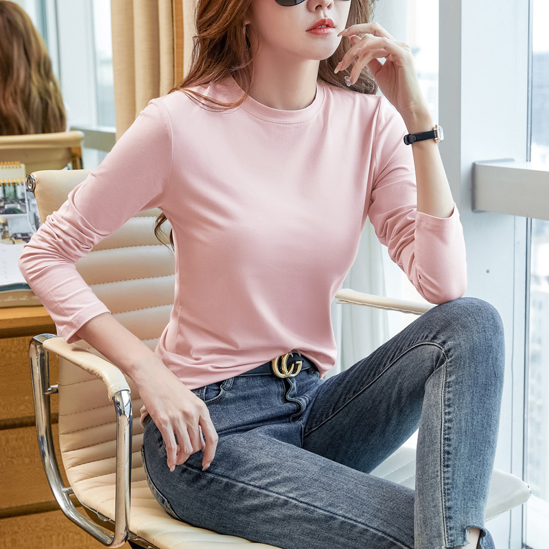 Yuwei 2671 # Real shot 2022 جديد قطن مرسيريزد للخريف تي شيرت نسائي برقبة دائرية بلون واحد تي شيرت نحيف للتخسيس متعدد الاستخدامات
