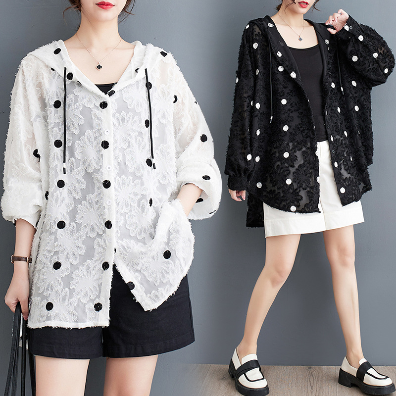 2023 صيف جديد فتاة سمينة فضفاضة عادية كل مباراة مقنعين البولكا نقطة مريحة مايكرو شفافة ملابس الحماية من الشمس تكييف الهواء قميص سترة