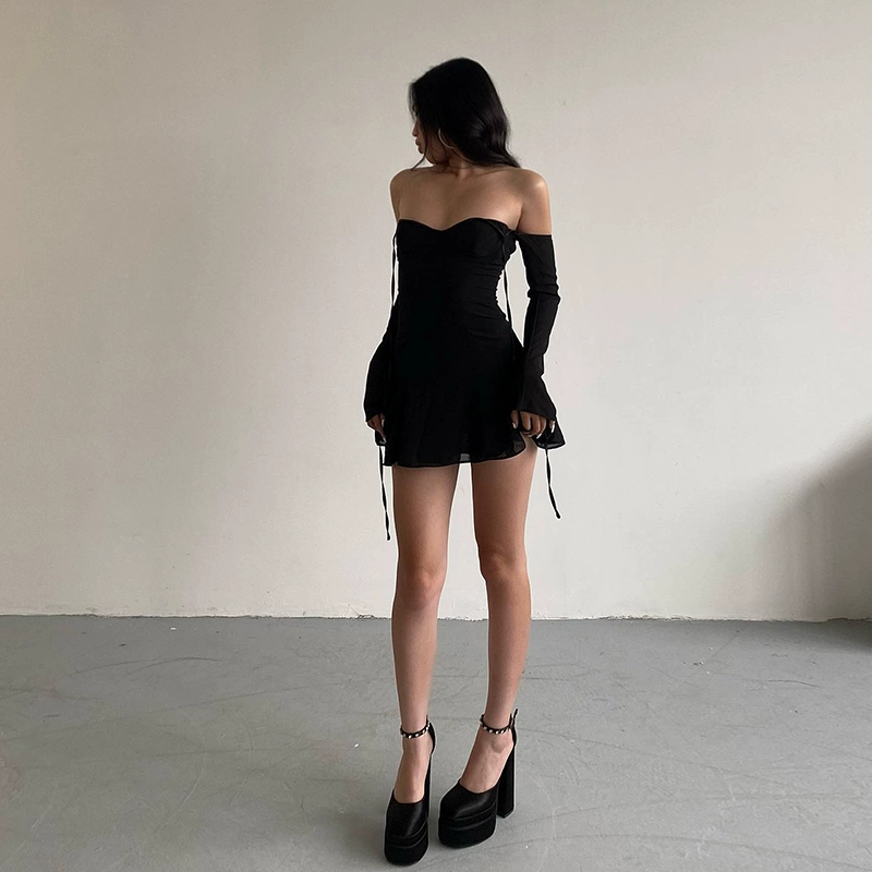 فستان أسود بأكمام طويلة للربيع والصيف مثير برقبة رسن رفيعة