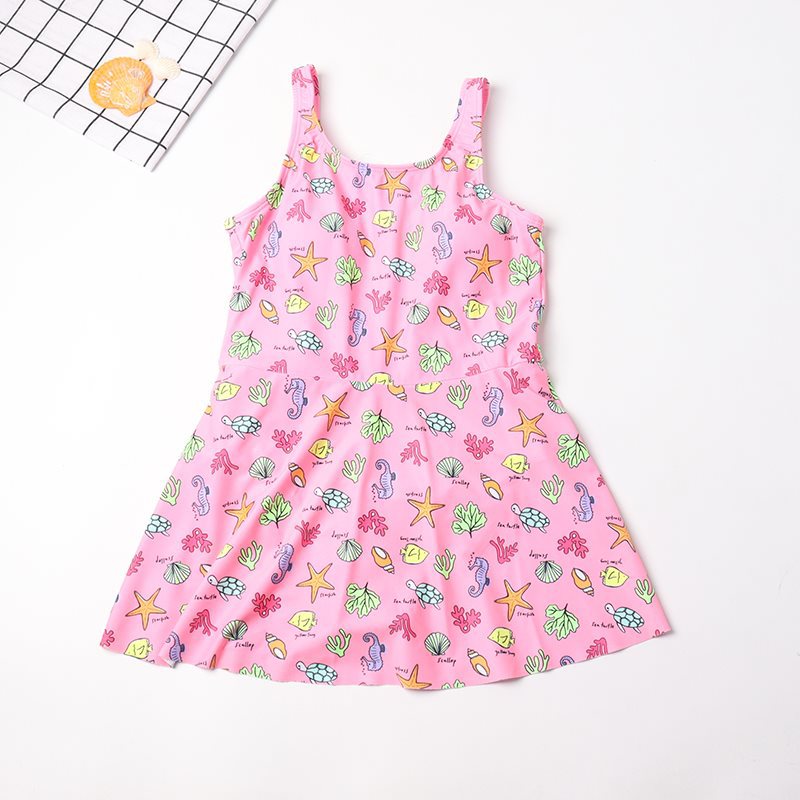 ملابس السباحة الصغيرة والمتوسطة الحجم للأطفال باللون الوردي من قطعة واحدة ملابس السباحة الكرتونية اللطيفة للفتيات ملابس السباحة ذات التنورة الصيفية