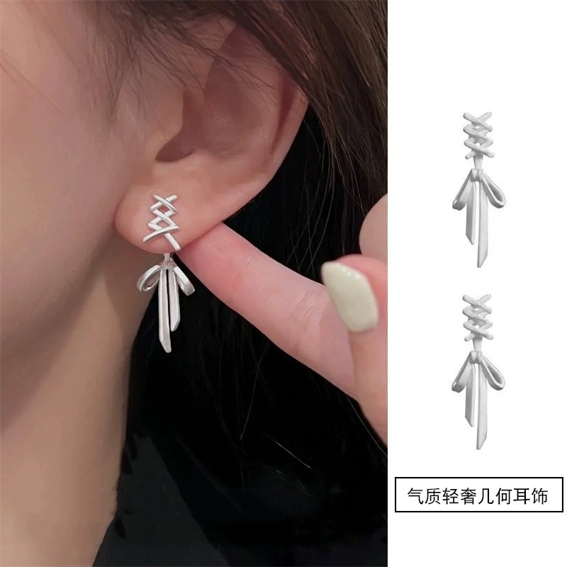 أقراط جميلة على شكل فيونكة للنساء، خط مزدوج الارتداء متقاطع S925 أقراط إبرة فضية في أقراط متعددة الاستخدامات