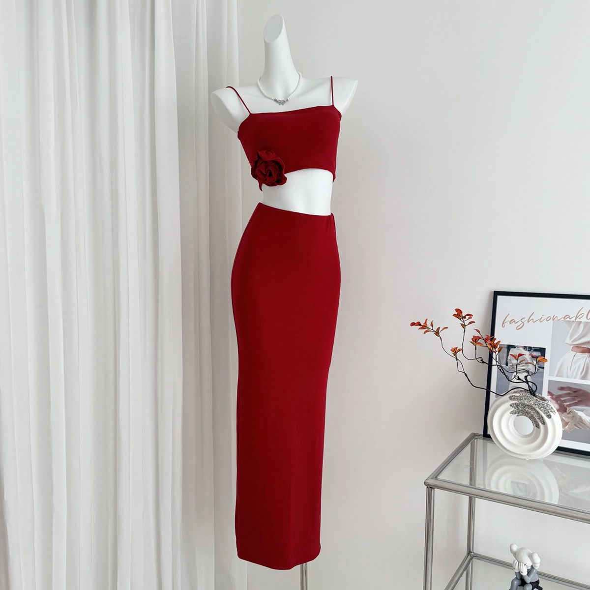 Taozi بدلة شاطئ قصيرة بدون أكمام على شكل زهرة حمراء ذات رسن علوي مثير لتنورة تعانق الورك للنساء
