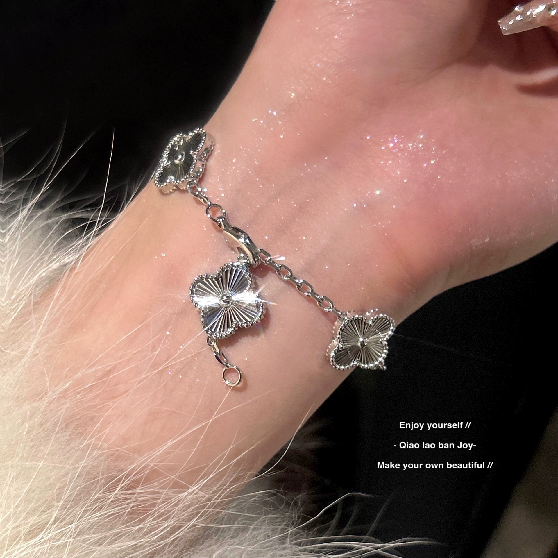 [Boss Joe Joy] سوار البرسيم بأربع أوراق، سوار المشكال، ألماس فضي متلألئ بالليزر، بسيط، راقي، اتجاه فاخر خفيف