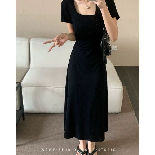 فستان ربيعي برقبة مربعة وخصر رمادي كسول