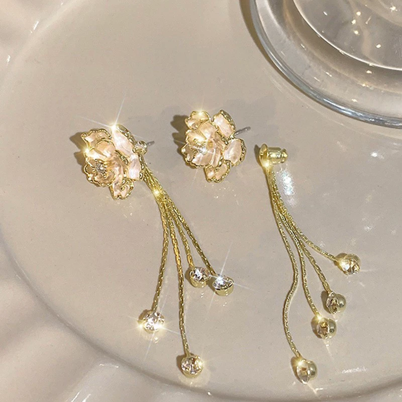 S925 الفضة إبرة الكاميليا الكورية شرابة طويلة بسيطة مزاجه المتخصصة ضوء الأقراط الفاخرة تصميم الراقية