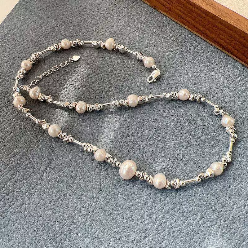 قلادة من اللؤلؤ الفضي المكسور للسيدات بسيطة على الموضة بمزاج فاخر S925 سلسلة ترقوة فضية من الفولاذ المقاوم للصدأ سوار على الموضة
