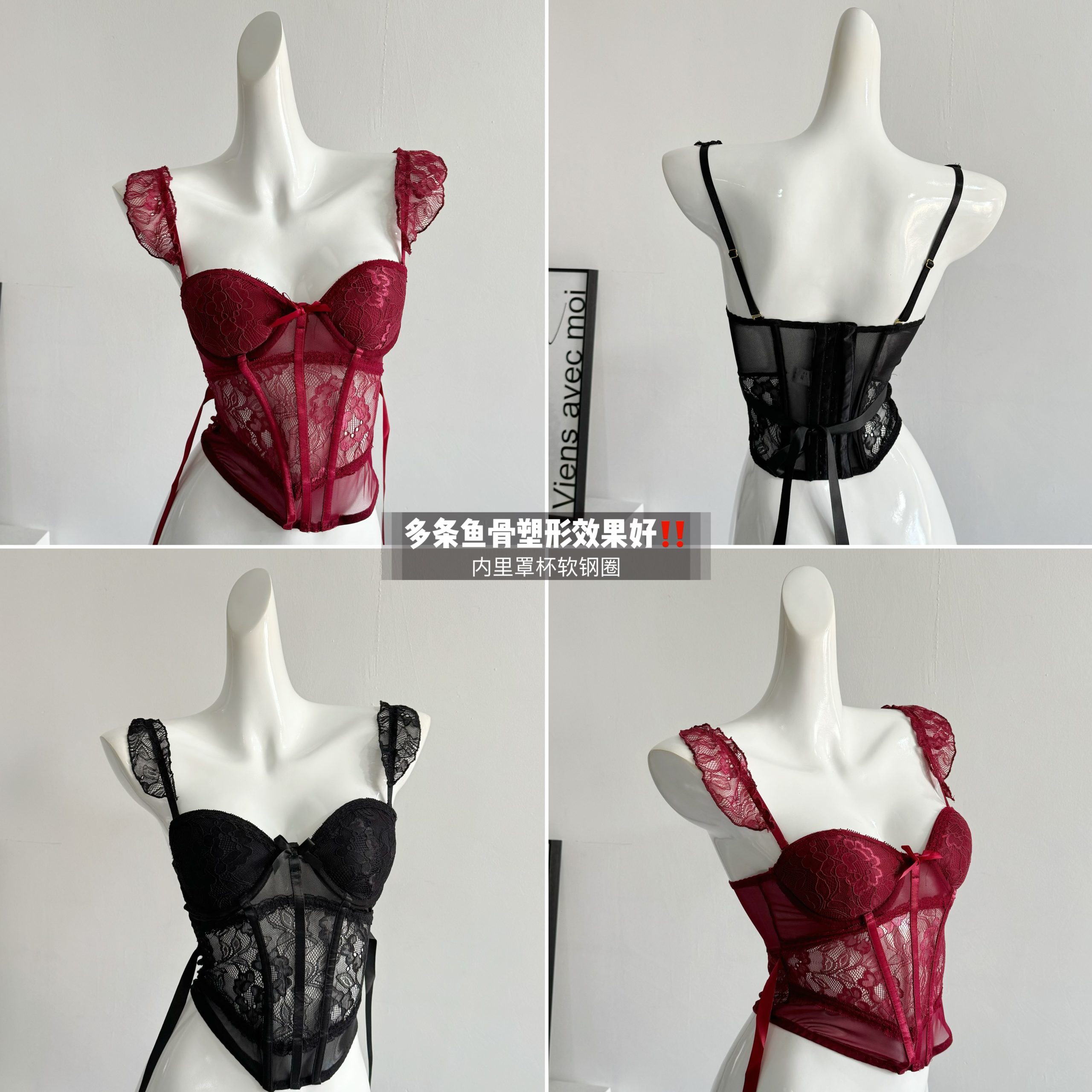 قميص قصير برقبة دائرية من الدانتيل الأحمر للنساء في الخريف مع وسادات صدر على شكل هيكل السمكة وحمالة صدر وقميص داخلي مثير