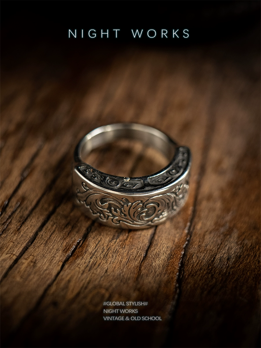 NIGHT WORKS “Vine Adventure” خاتم الطوطم المنحوت على شكل نبات داكن قديم للرجال مقاس كبير